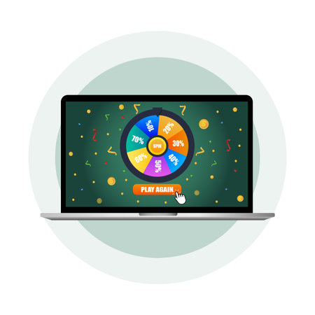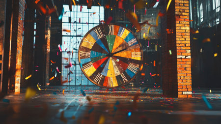 A lively wheel of fortune spins wildly with a bright arrow and scattered confetti, creating an engaging atmosphere perfect for celebrations and games.