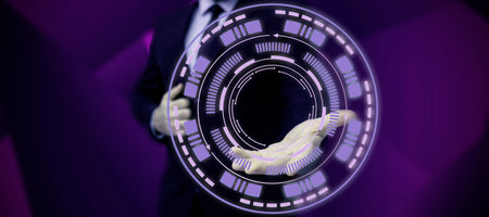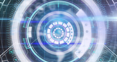 Round scanner and spot of light against data processing on blue background. computer interface and technology concept