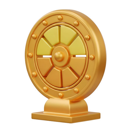 a 3D rendering of a golden wheel with a green center, placed on a square base. The wheel is divided into eight segments, with alternating colors of green and gold. The outer ring of the wheel is adorned with evenly spaced golden rivets, adding to its detailed and polished appearance. The base is also golden and has a slightly textured surface, providing a stable support for the wheel. The overall gives a vintage and industrial feel, reminiscent of mechanical or gear-like