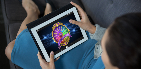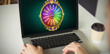 Graphic image of wheel of fortune on mobile screen against cropped hands of woman using laptop
