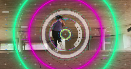 Image of data processing over caucasian woman running. Global networks, digital interface, computing and data processing concept digitally generated image.