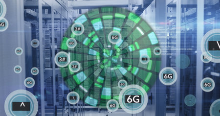 5g and 6g text on round banners against green abstract circular shape and computer server room. global networking and business data storage technology concept