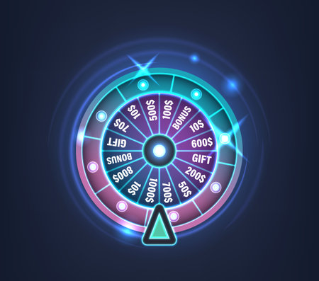 Vibrant, Neon-lit Spinning Wheel Of Fortune Displaying Rewards Like Cash Prizes, Bonuses, And Gifts, 3d Vector Image