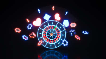 Casino roulette wheel with colorful neon lights. 3d rendering