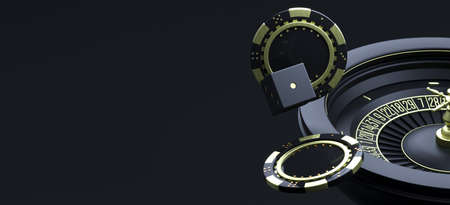 Modern casino background with place for text. Luxury casino roulette wheel on black background with copy space. Online casino theme. Poker game table. 3d rendering.