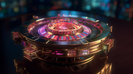 Brightly lit with vibrant LED lights, a futuristic roulette wheel spins in an upscale casino, showcasing a dynamic blend of colors and excitement for players nearby.