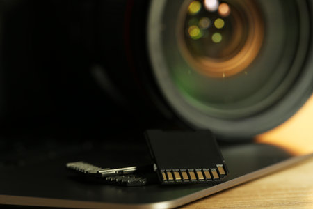 SD memory cards, laptop and photo camera on wooden table, closeup
