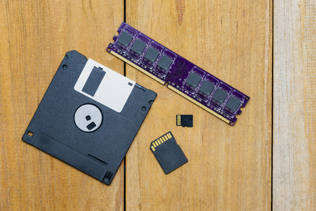 Diskette ,SD card, Micro SD card and memory were put together on wood board