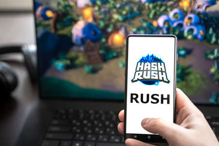 Russia Moscow 30.05.2021.Logo, screenshot of blockchain nft ethereum cryptocurrency game Hash Rush in laptop, mobile phone screen. Man playing, mining crypto coins Rush. Earning money with Lands, heroes.