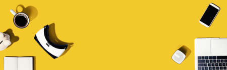game gadgets for virtual reality. top view of VR glasses, smartphone and wireless headphones.