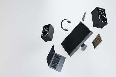 Abstract flying tech pieces on white background with mock up place. Laptop computer, speakers and headphones. Music and technology concept. 3D Rendering