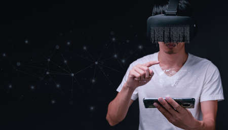 businessman wearing virtual reality goggles in modern office with Smartphone using with VR headset with screen icon diagram