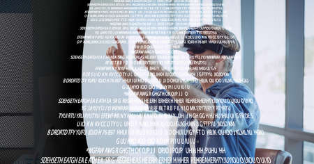 Data processing over man wearing vr headset at office against technology background. global business and futuristic technology concept