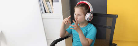 Distance learning online education. A schoolboy boy studies at home and does school homework. A home distance learning