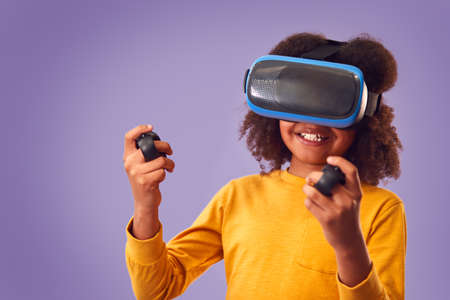 Studio Shot Of Boy Wearing Virtual Reality Headset Gaming With Controller Against Purple Background