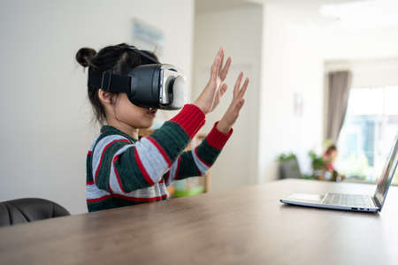 Exited asian girl wearing virtual reality headset to watching video or play video game and touch something on the air.