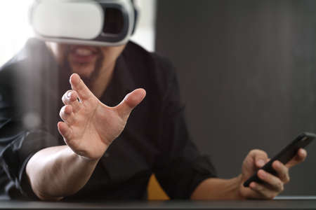 businessman wearing virtual reality goggles in modern office with mobile phone using with VR headset
