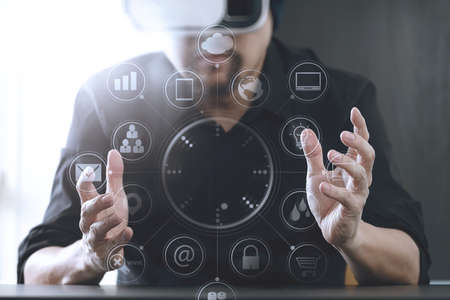 businessman wearing virtual reality goggles in modern office with mobile phone using with VR headset with screen icon diagram