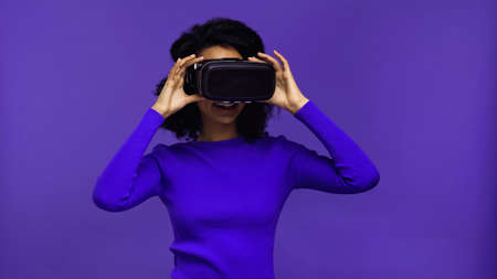 curly african american woman adjusting vr headset isolated on purple