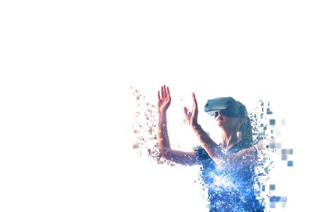 A girl in virtual reality glasses is pixelated or scattered into pixels. VR concept. Modern technologies.