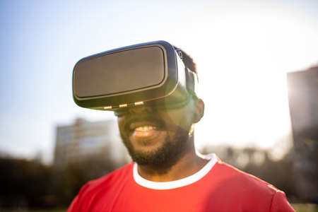 happy man in virtual reality glasses in football field background is blurred concept of virtual reality outdoors summer sunny day