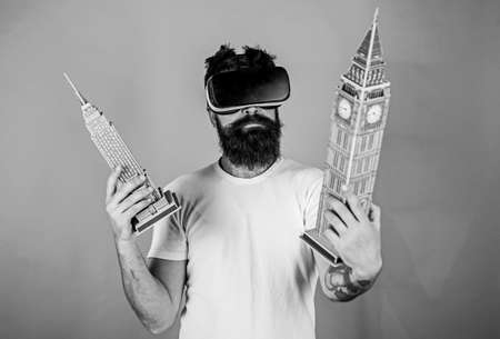 Guy holds Big Ben and Empire State Building. Man on busy face creates architecture, rendering 3D design in virtual reality. 3D design concept. Man with beard in VR glasses, green background