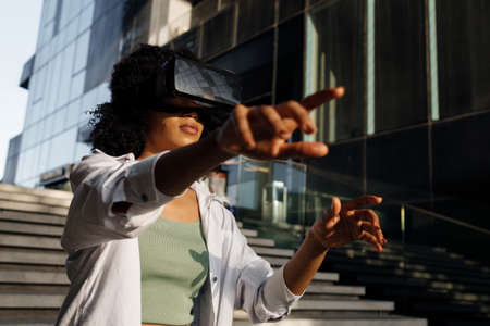 Young woman testing VR glasses outside. Female wearing virtual reality headset during summer weather