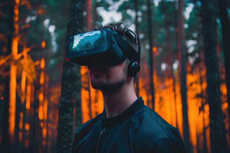 Man wearing virtual reality goggles in the forest. Concept of virtual reality.