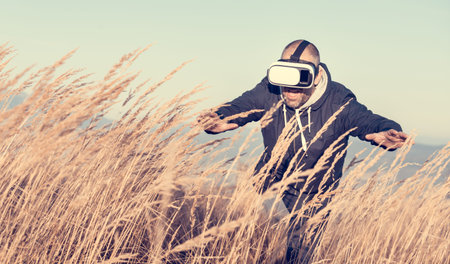 Happy man runs on the meadow in goggles for virtual reality VR - concept of freedom in the virtual world - modern lifestyle of young people combined with nature