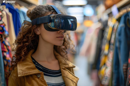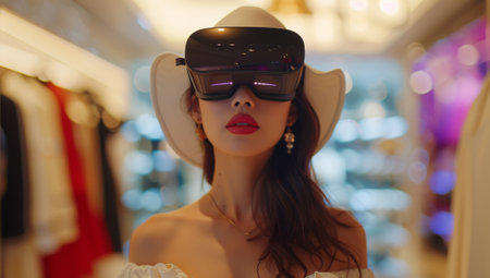 Black woman wearing a virtual augmented reality headset exploring a stylish and modern clothing store. Concept of technology, shopping, and fashion integration.