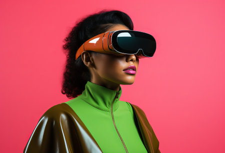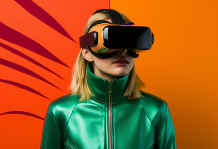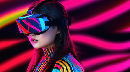 Young woman with virtual reality goggles on colored background. Futuristic lifestyle. VR Metaverse technology concept., by ai generative