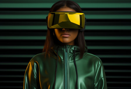 Young woman with virtual reality goggles on green background. Futuristic lifestyle. VR Metaverse technology concept., by ai generative