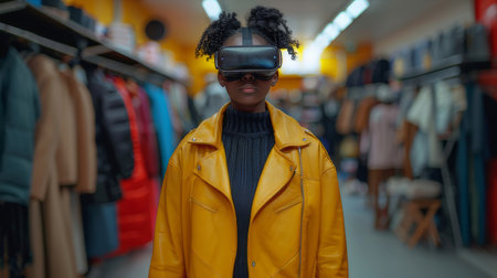 A young Black woman wearing virtual reality glasses stands amid a colorful clothing store, clad in a chic yellow leather jacket.