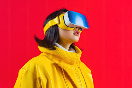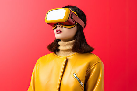 Fashionable young woman in yellow suit with virtual reality goggles on red background