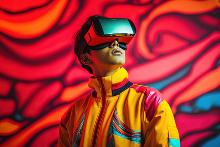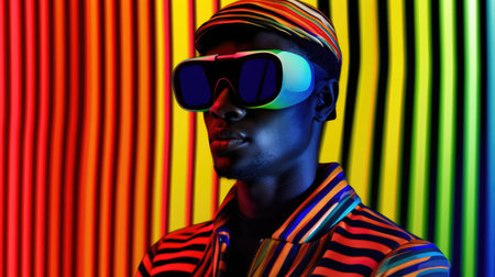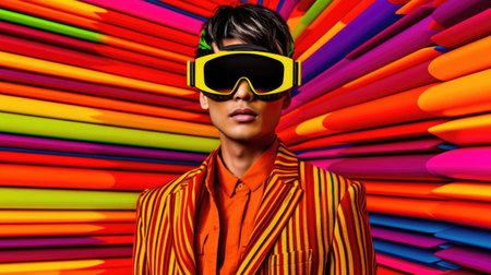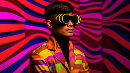 Young male model wearing VR posing with trendy fashion outfit and colorful vibrant glowing pink lime green optical art abstract background. Picturesque generative AI