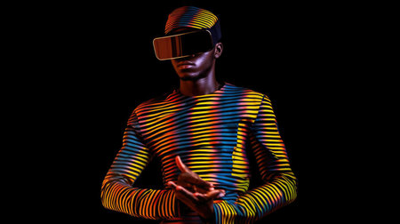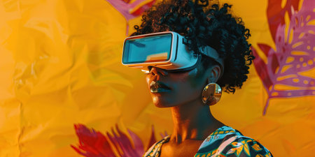 Young african female model wearing VR posing with trendy fashion outfit and colorful optical art abstract background. Picturesque generative AI