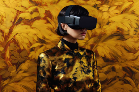 Modern woman in a black futuristic costume with golden elements in virtual reality glasses on a golden background AI