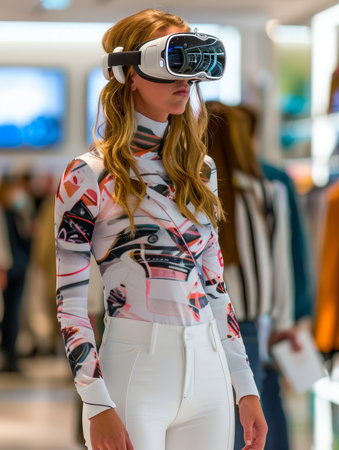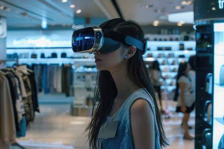 Trendy woman with VR headset browsing through virtual interface in modern retail store AI