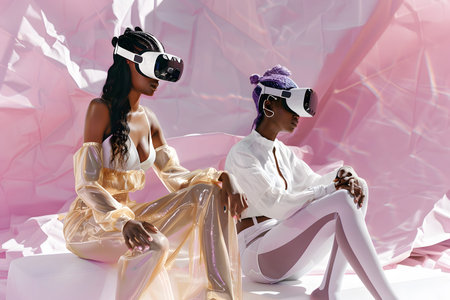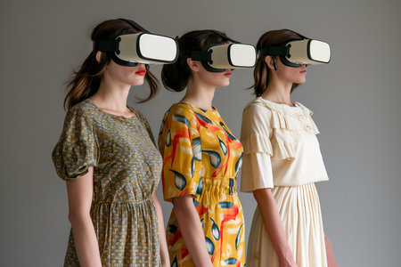 Three young women wearing virtual reality headsets gaze forward in a futuristic, ethereal environment.