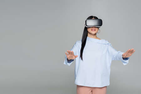 Young woman in virtual reality glasses pressing her finger on the touchscreen, added gradient on a light background.