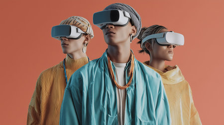 Fashionable young people wearing a mixed reality headset and experiencing simulation, metaverse and cyberspace.