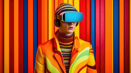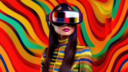 Young female model wearing VR posing with trendy fashion outfit and colorful optical art abstract background. Picturesque generative AI