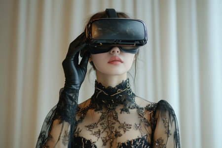 A woman with an elegant outfit and gloves is engaged in a virtual reality experience.