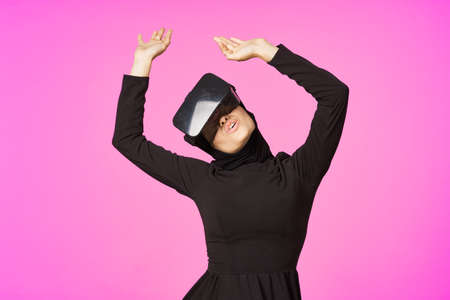 Woman with glasses of virtual reality. Future technology concept, pink background, generative ai art