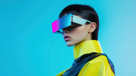 Stylish young woman in futuristic glasses and vibrant yellow outfit against a blue background, embodying modern fashion and technology