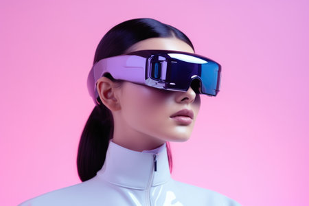 Young woman with virtual reality goggles on pink background. Futuristic lifestyle. VR Metaverse technology concept., by ai generative