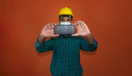 Engineer, architect or worker with yellow helmet and pandemic mask isolated on white background