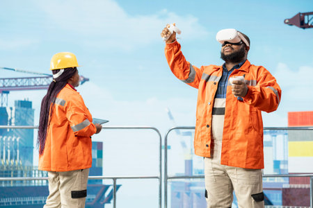 African american engineer on offshore platform wears virtual reality gear to oversee oil and gas drilling simulation, using augmented technology for advanced industrial maintenance.