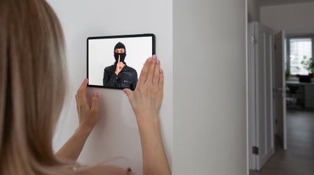 Protection of private residential building with help of an external video surveillance system. an application on smartphone screen. CCTV view of burglar breaking into home