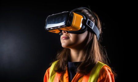 A woman wearing a safety vest wearing a virtual reality headset
